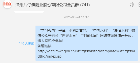 以學(xué)促行,筑牢節(jié)水根基。公司發(fā)動(dòng)全員積極參與在“學(xué)習(xí)強(qiáng)國(guó)”學(xué)習(xí)平臺(tái)開展的“世界水日”“中國(guó)水周”每日答題以及由水利部官網(wǎng)、“中國(guó)水利”“法治水利”等微信公眾號(hào)開展的圍繞節(jié)水、水資源管理等內(nèi)容的網(wǎng)絡(luò)答題活動(dòng)。通過(guò)學(xué)習(xí)、答題,讓職工干部掌握《節(jié)約用水條例》的內(nèi)涵要義,進(jìn)一步學(xué)習(xí)習(xí)近平總書記關(guān)于治水的重要論述,以知促行指導(dǎo)工作實(shí)踐,積極踐行文明健康綠色環(huán)保的生活理念。