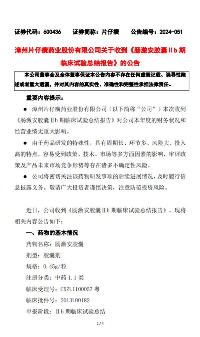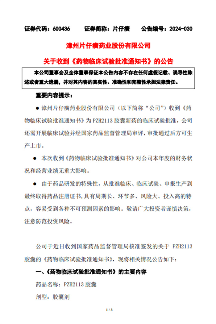 片仔癀公司圍繞未滿足臨床需求的慢性病、難治性疾病等領(lǐng)域,科學(xué)規(guī)劃布局,加快推進(jìn)中藥創(chuàng)新藥、化藥創(chuàng)新藥和古代經(jīng)典名方等18個新藥項目的開發(fā)。2024年,用于治療輕、中度廣泛性焦慮障礙(痰熱內(nèi)擾證)的中藥創(chuàng)新藥PZH1204進(jìn)入Ⅲ期臨床研究;用于治療腹瀉型腸易激綜合征(肝氣乘脾證)的中藥創(chuàng)新藥PZH1201完成Ⅱb期臨床試驗并取得臨床試驗總結(jié)報告;用于治療纖維肌痛的化藥創(chuàng)新藥PZH2107完成Ⅰ期臨床試驗并取得臨床研究報告;用于治療以彌漫性大 B 細(xì)胞淋巴瘤為主的復(fù)發(fā)性/難治性非霍奇金淋巴瘤的化藥創(chuàng)新藥PZH2113膠囊獲批臨床;用于治療卵巢儲備功能下降的中藥創(chuàng)新藥PZH1219申報臨床獲國家藥監(jiān)局受理,企業(yè)核心競爭力和創(chuàng)新發(fā)展后勁不斷提升。