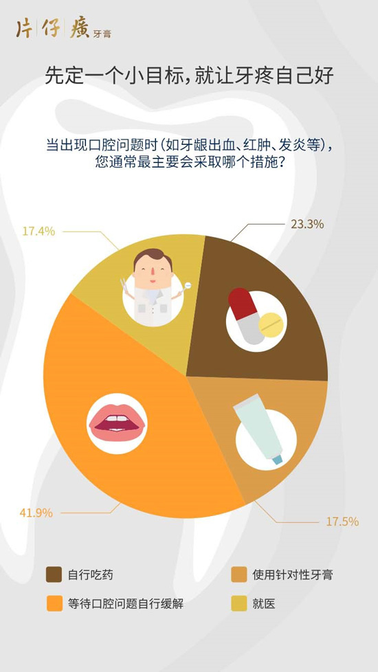 數(shù)據(jù)顯示,當(dāng)口腔出現(xiàn)問題時,有17.5%的網(wǎng)友會選擇針對性的牙膏來解決口腔問題。尤其是當(dāng)口腔出現(xiàn)出血癥狀時,選擇牙膏作為改善口腔健康的被調(diào)查者比例最多,為19.5%