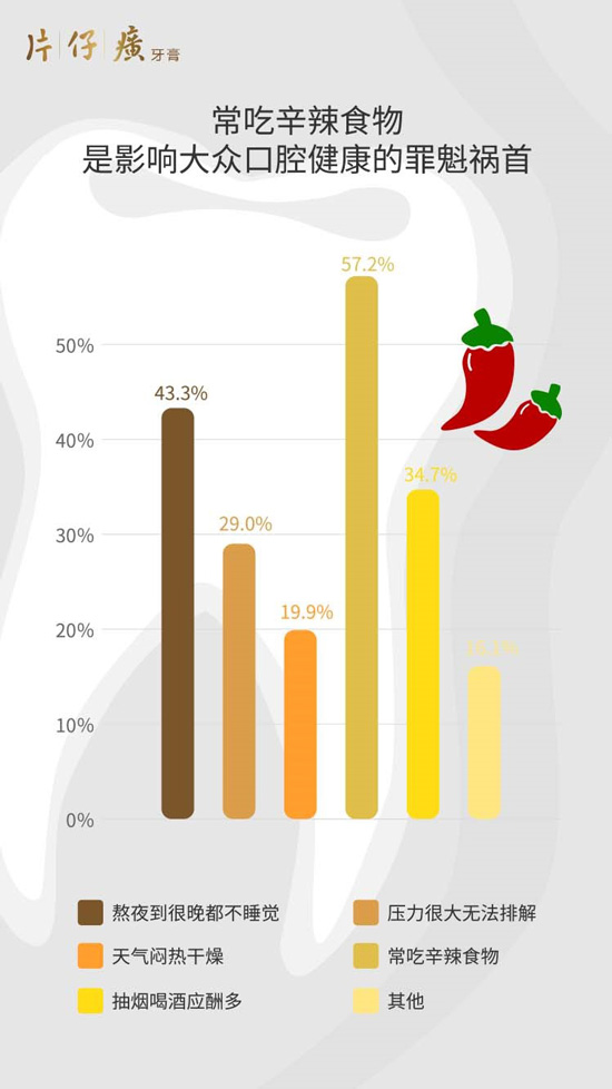 在關(guān)于導(dǎo)致口腔問題因素的調(diào)查中,被調(diào)查者所認(rèn)同的主要原因呈現(xiàn)的結(jié)果顯示:常吃辛辣食物成為用戶認(rèn)為影響口腔健康的頭號殺手,其被認(rèn)同的比例占所有被調(diào)查者總數(shù)的57.2%。