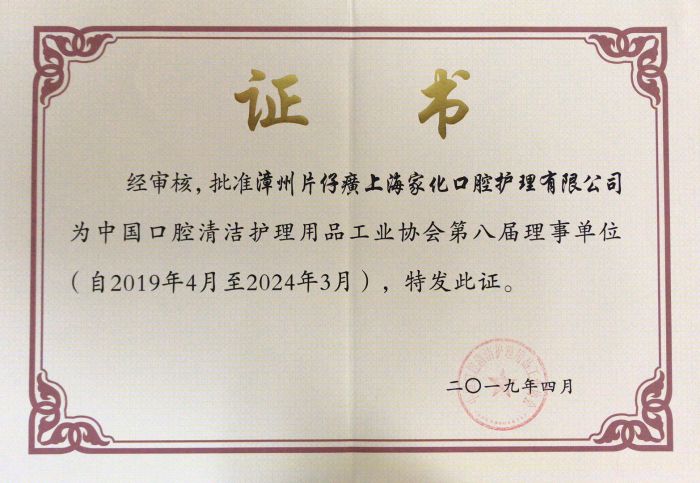 漳州片仔癀上海家化口腔護(hù)理有限公司 榮獲“中國口腔清潔護(hù)理用品工業(yè)協(xié)會第八屆理事單位”稱號