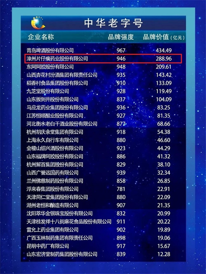 2019中華老字號品牌價值排行榜第二名(品牌價值288.96億)