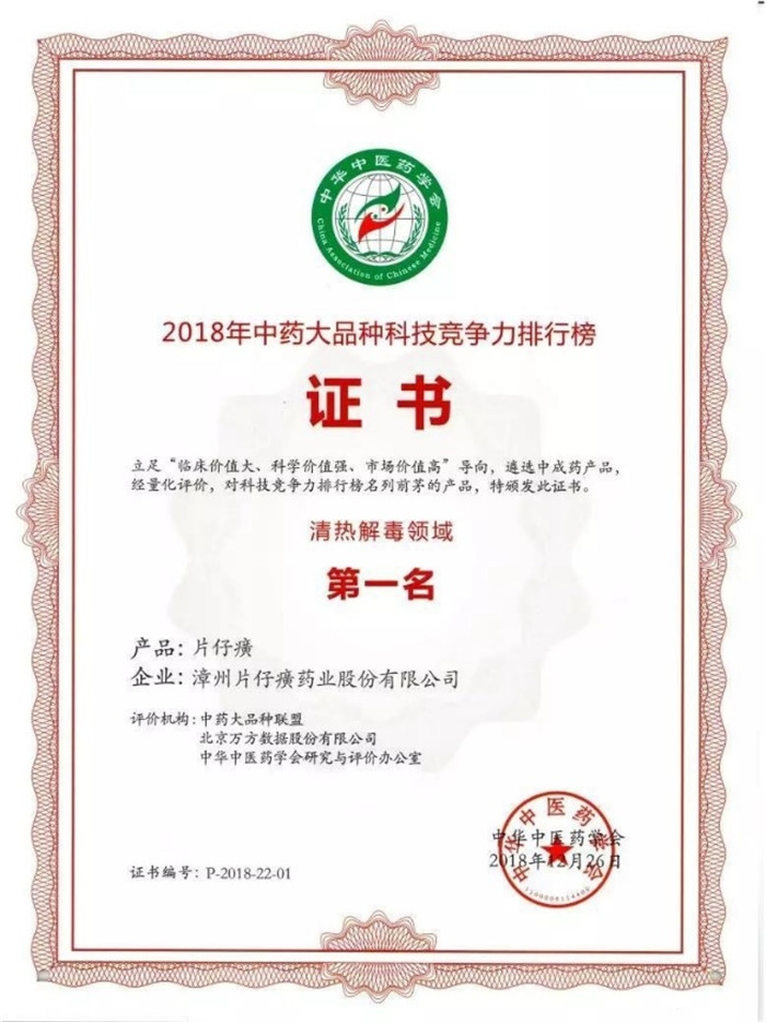 2018年中藥大品種科技競爭力排行榜(清熱解毒領(lǐng)域)第一名.