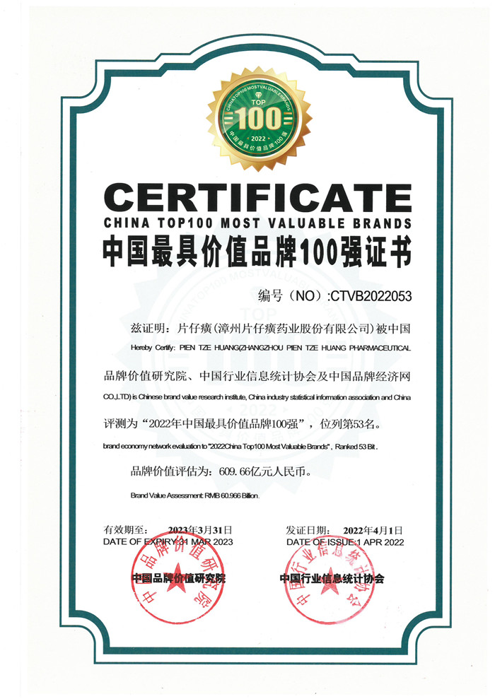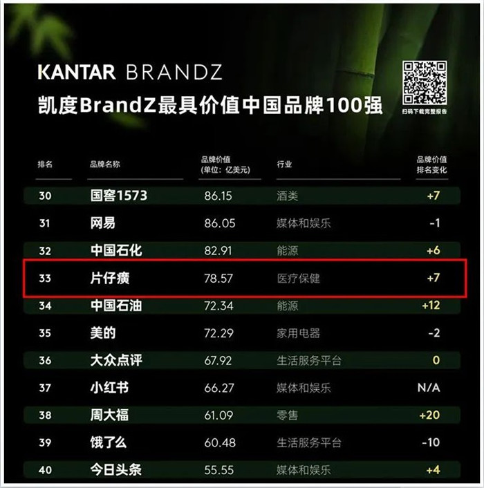 片仔癀以品牌價(jià)值78.57億美元位列“2022年凱度BrandZ最具價(jià)值中國品牌100強(qiáng)”第33位
